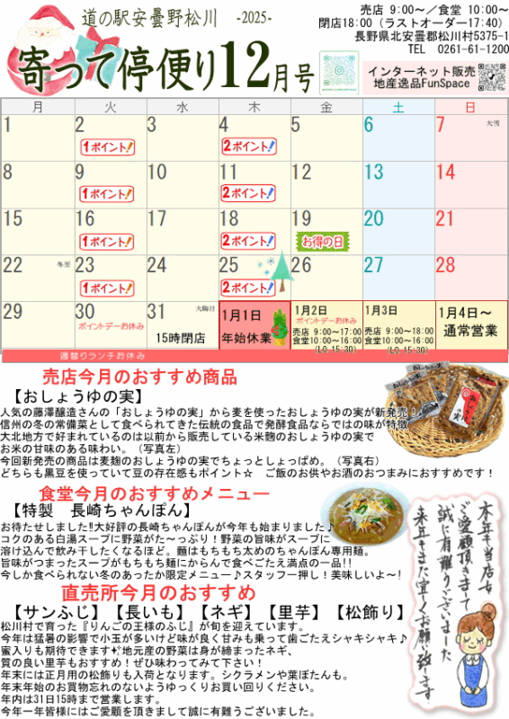 12月カレンダー 2025 12/02 スタッフブログ 2025/12/2 スタッフブログ 関連記事 1月カレンダー 2025/12/31 松飾り 2025/12/16 越冬野菜市開催しました 2025/11/14 11月カレンダー 2025/11/5 りんごまつり開催しました 2025/10/20 10月カレンダー 2025/10/1 9月カレンダー 2025/9/12 初夏の収穫祭を開催しました 2025/6/16